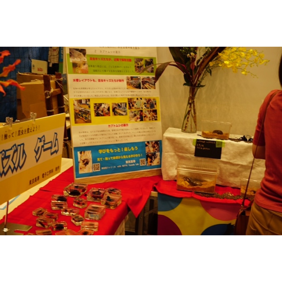 ファミーユでは、年に3回開催している「カブトムシ・クワガタ展示会」。今回の環境フェスティバルで、今までの活動を展示してきました。